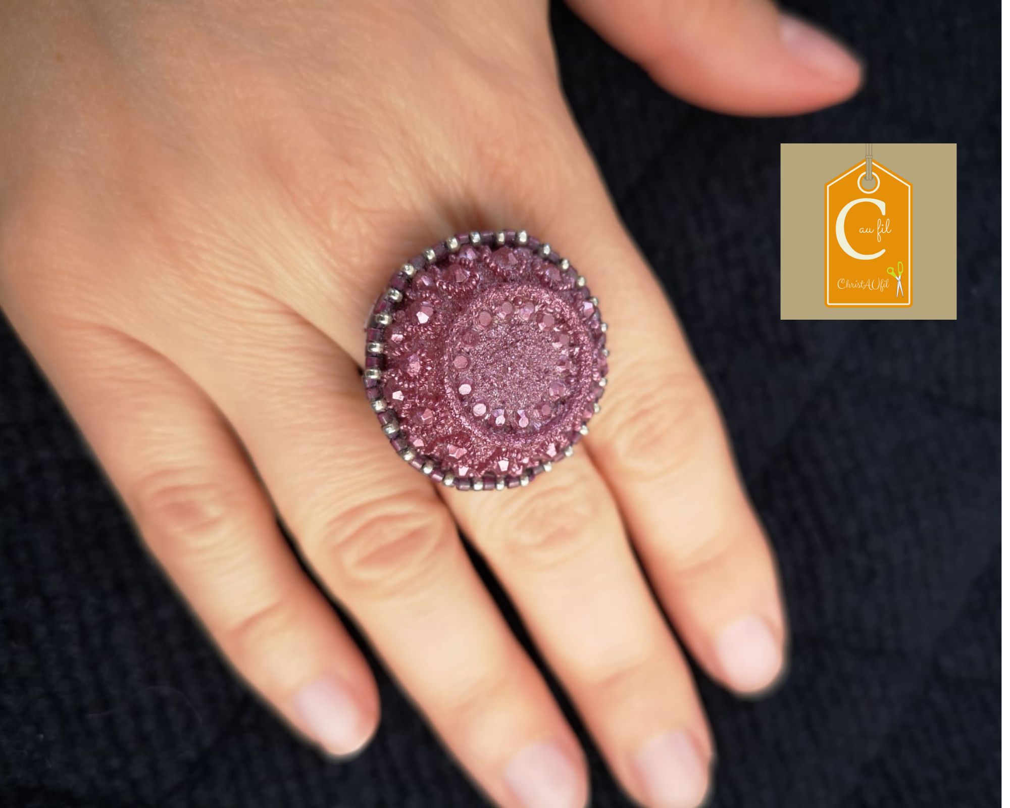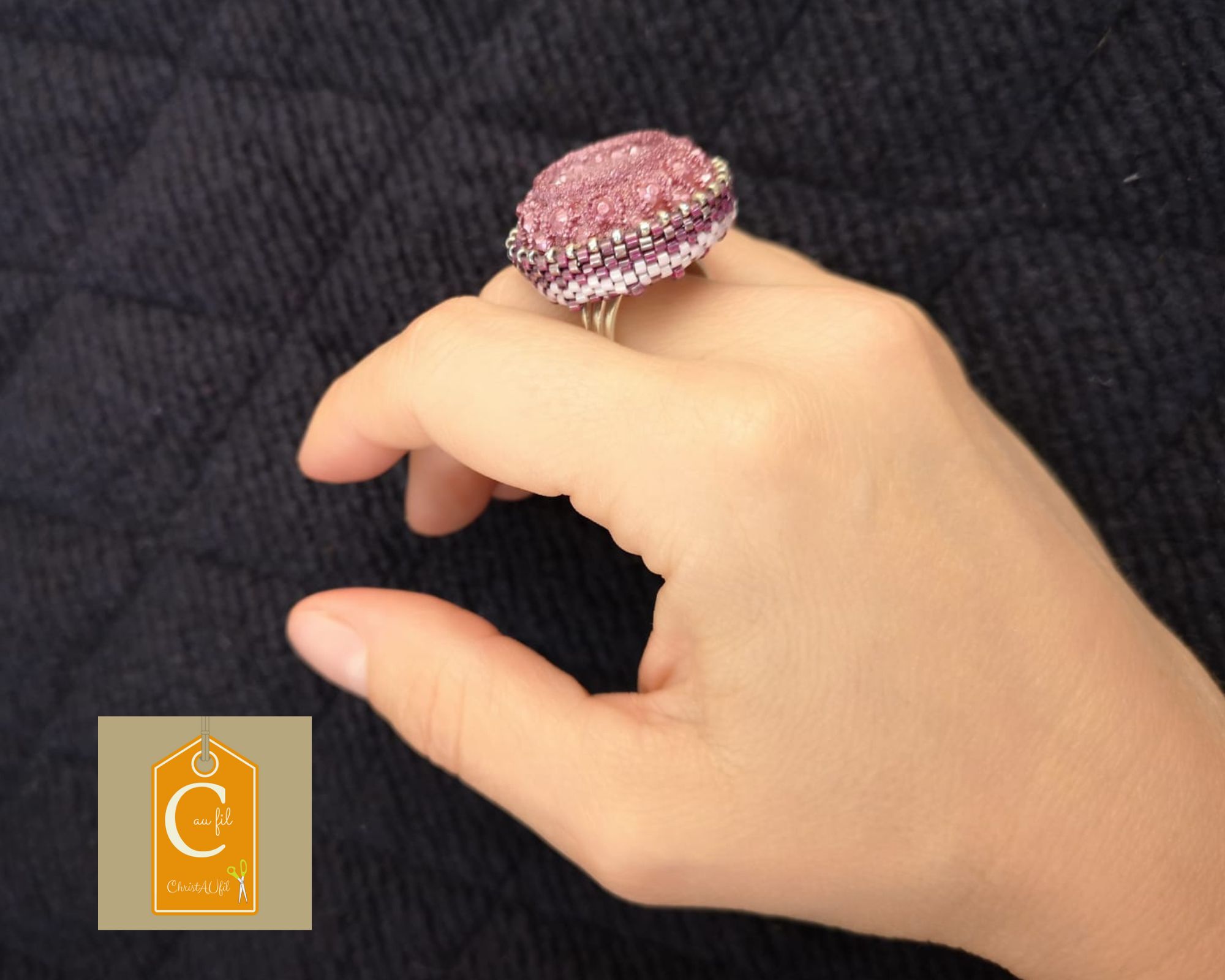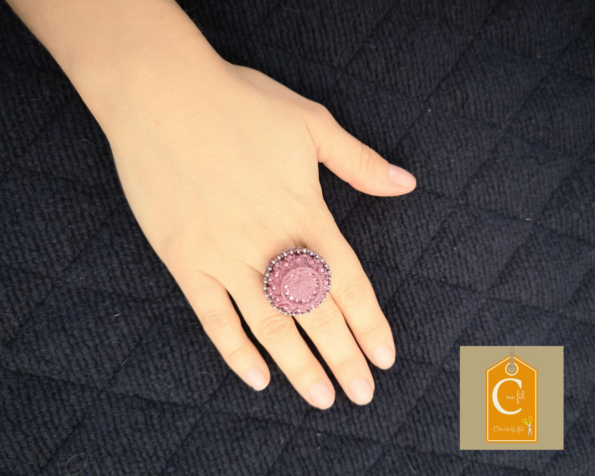 Bouton ancien ref 24028 couleur framboise tout à fait original en relief. Diamètre 3 cm serti de perles japonaises roses et couleur argentée. L’anneau argenté (sans nickel) est ajustable.