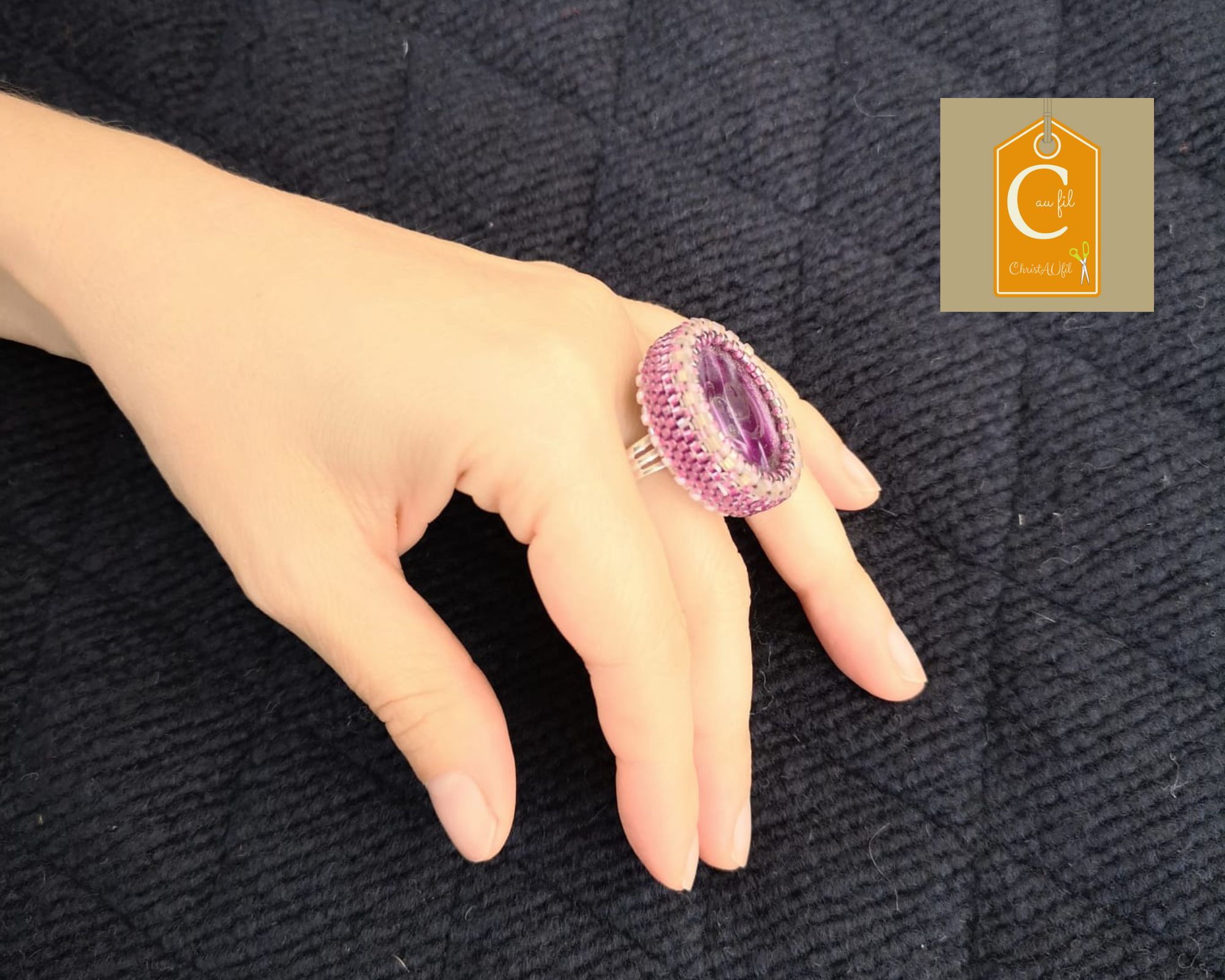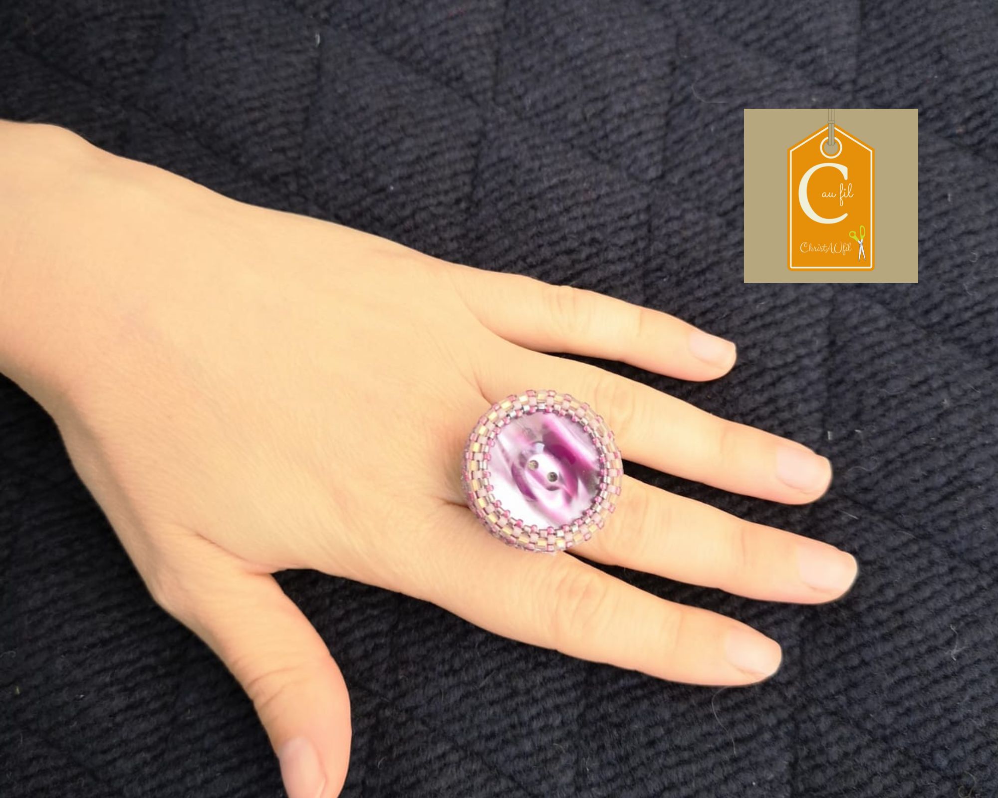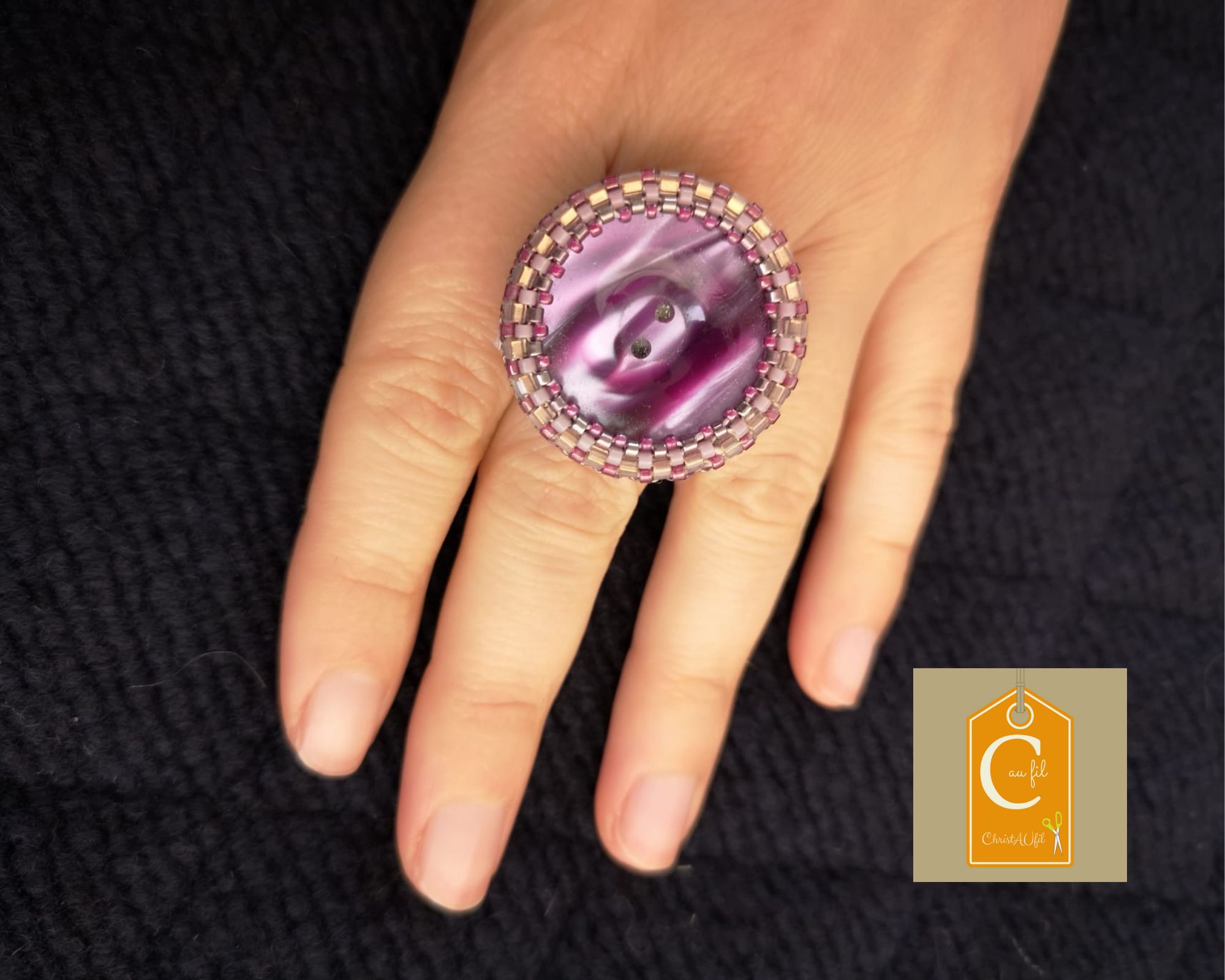 Bouton ref 24028 violet irisé avec 2 trous. Diamètre 3 cm serti de perles japonaises mauves irisées et blanches. L’anneau argenté (sans nickel) est ajustable. Modèle unique