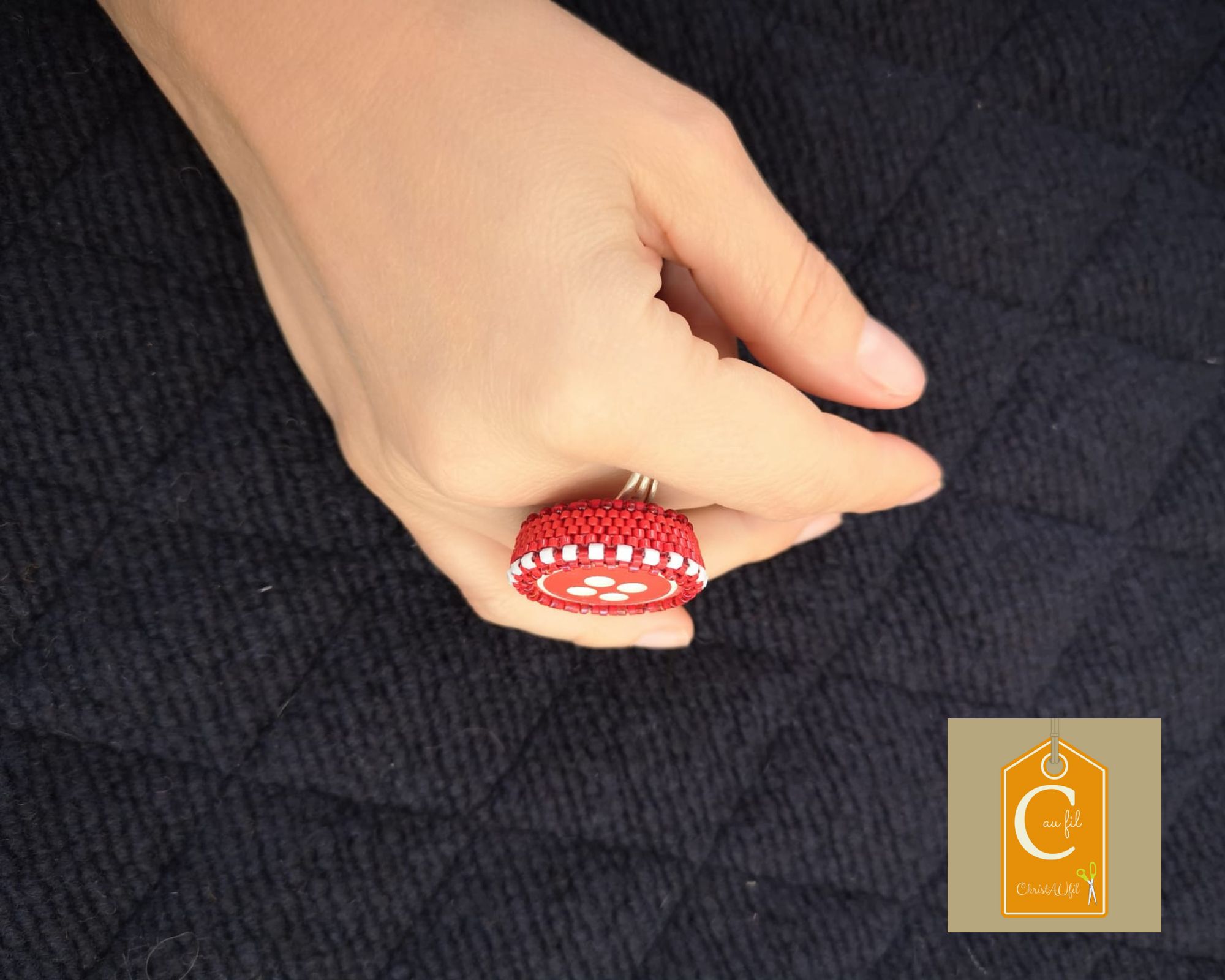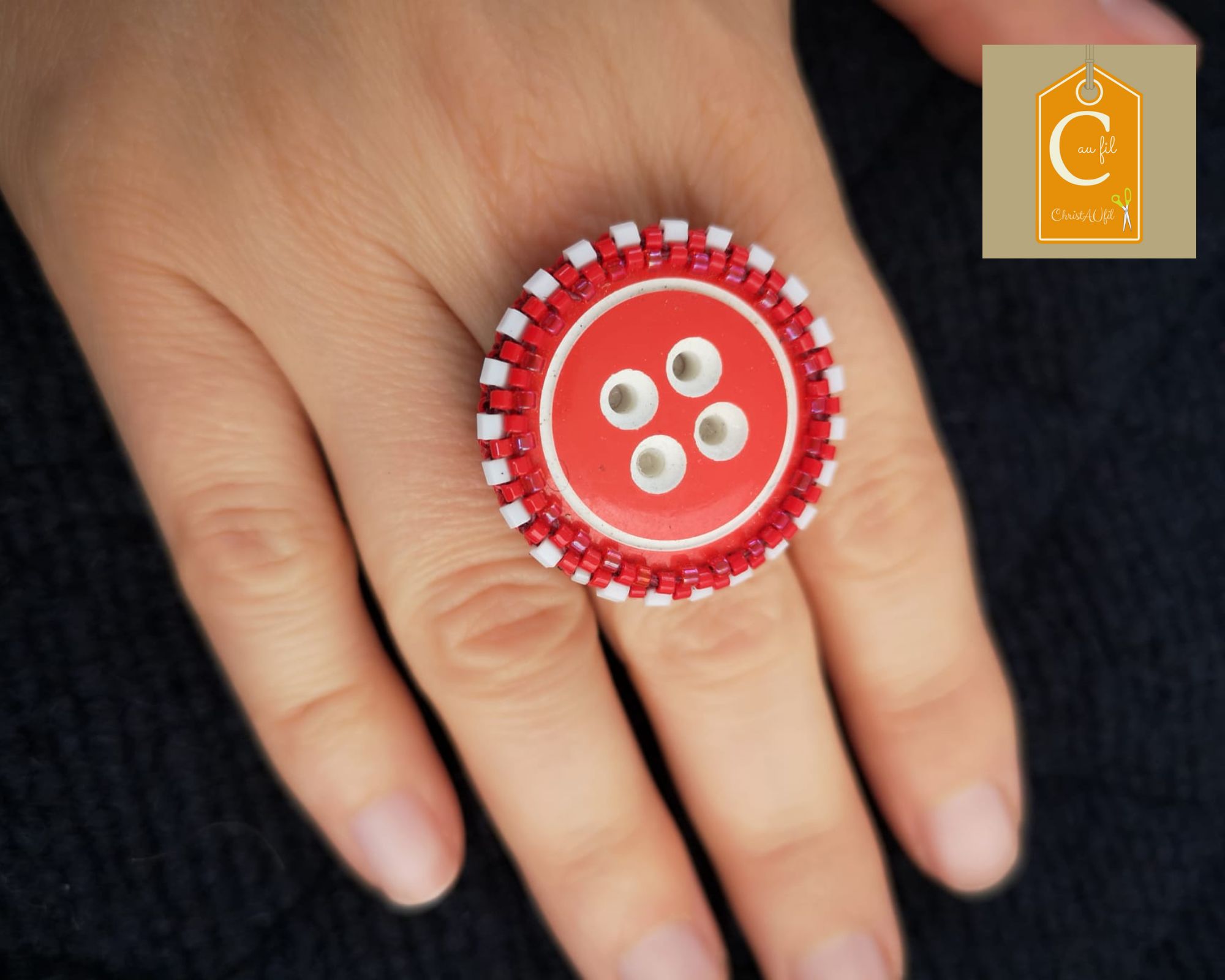 100% look bouton ref 24009 rond rouge avec ses 4 trous blancs. Diamètre 3 cm serti de perles japonaises rouges et blanches. L’anneau argenté (sans nickel) est ajustable.