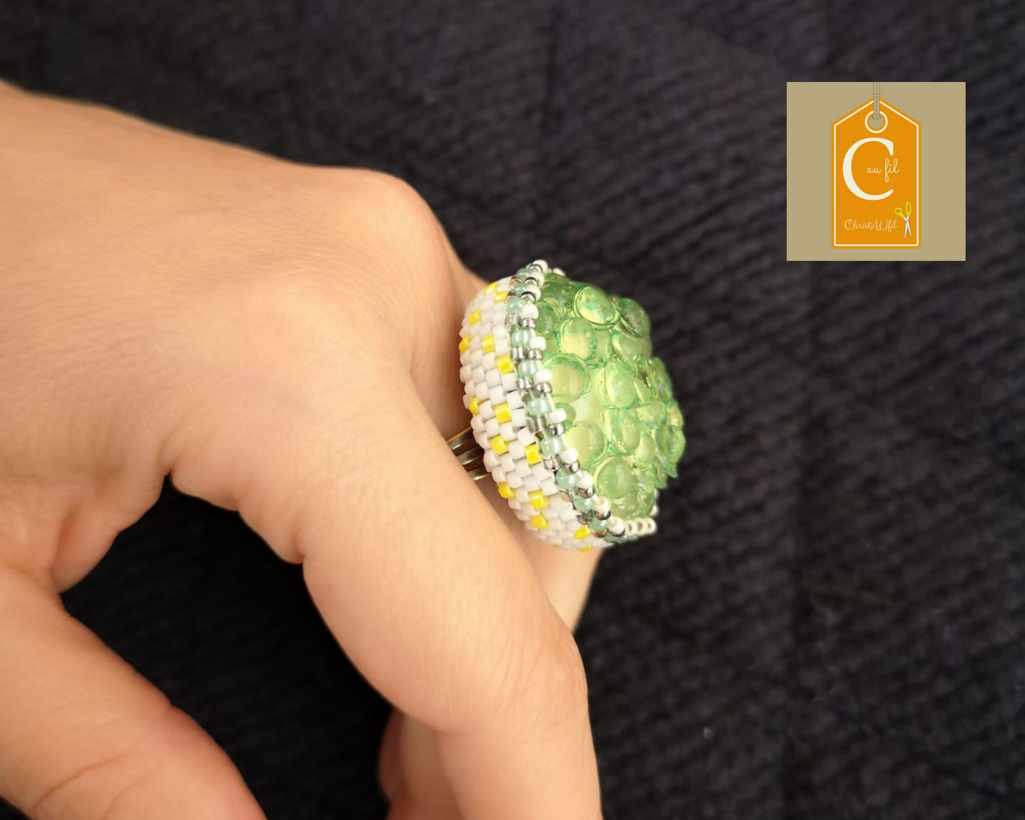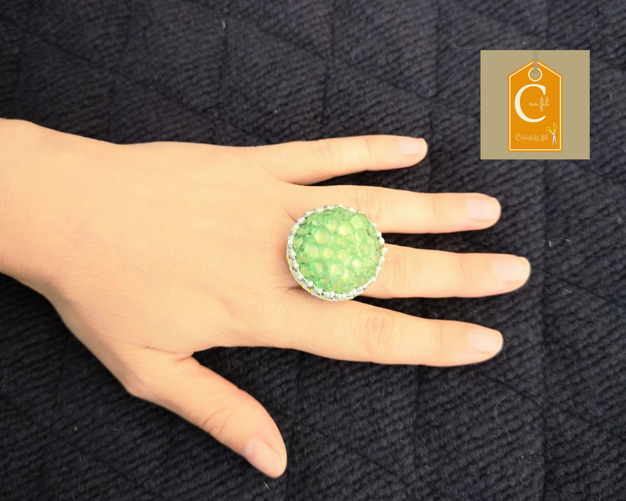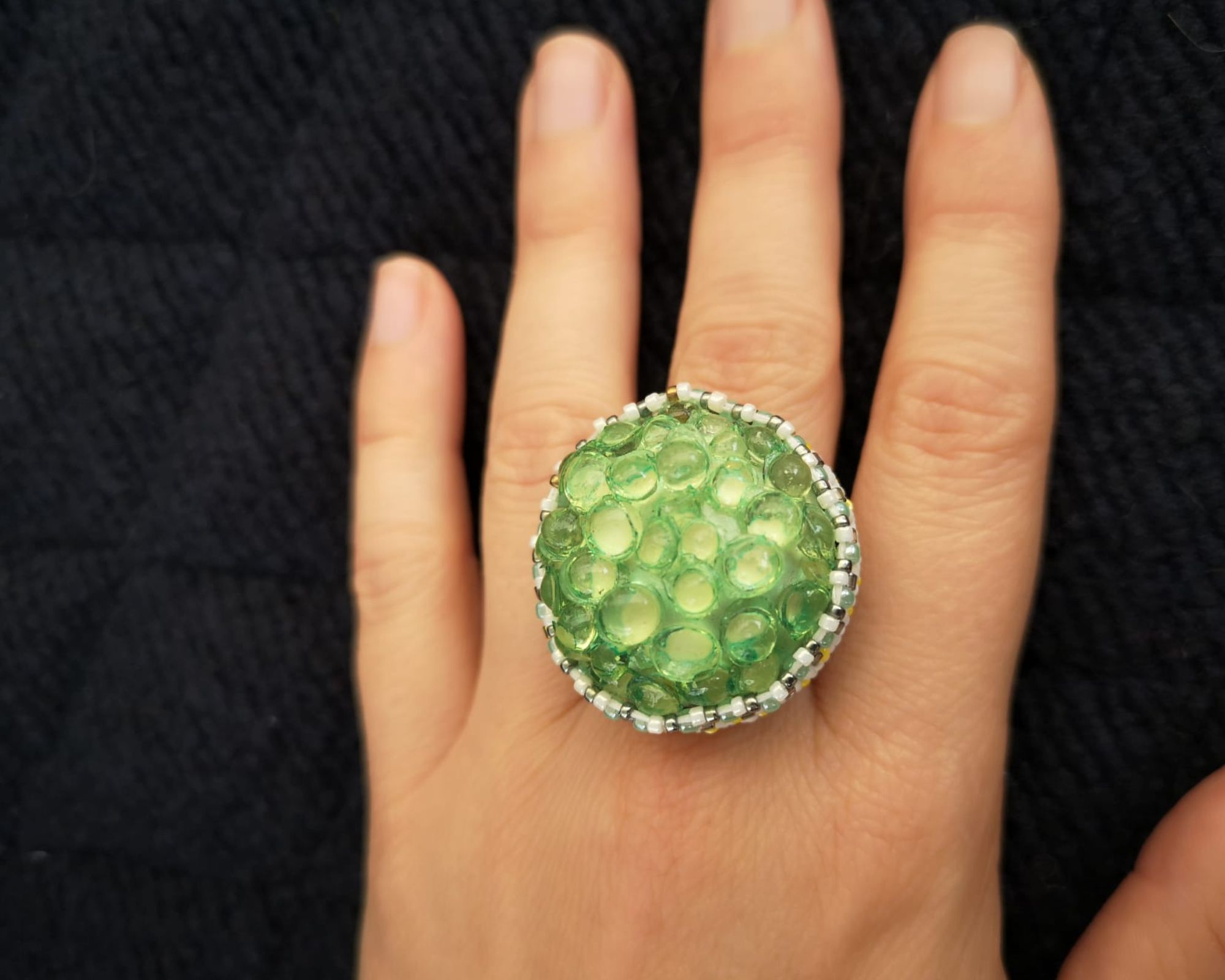 Bouton ref 25013 vert pomme tout à fait original avec ses petites « bulles » en relief. Diamètre 3,2 cm serti de perles japonaises blanches avec quelques touches de jaune. L’anneau argenté (sans nickel) est ajustable.
