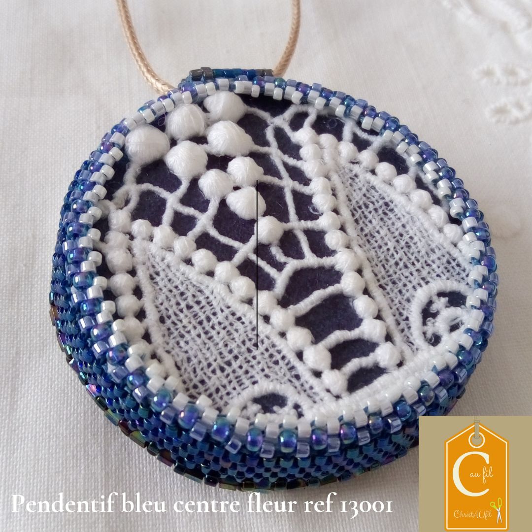 PENDENTIF bleu centre bouton fleur ref 13001. Bouton couleur bleue nuit, diamètre 5,5 cm serti de perles japonaises irisées bleues. Au centre, un plus petit bouton en forme de fleur. Le verso est agrémenté d’une dentelle blanche ancienne sur fond sombre. Pendentif entièrement fait main fourni avec un lien de longueur totale 62 cm avec fermeture. Peut être fourni avec un lien textile plus court à la place (sur demande) Modèle unique