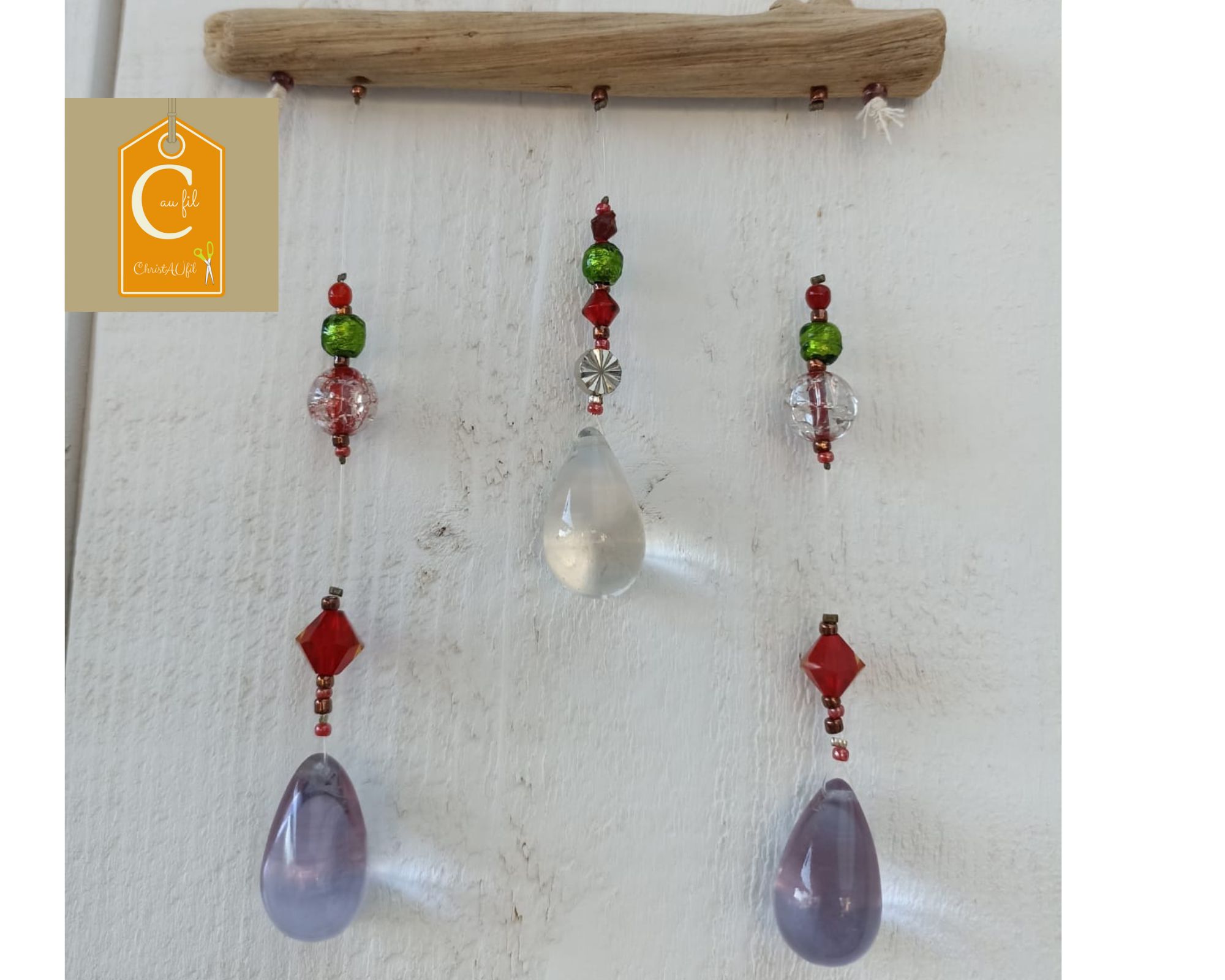 Suspension ref 85018 réalisée à partir de perles vertes et rouges et de 2 pampilles en verre mauve et 1 pampille en verre transparent. Elle saura apporter des couleurs et jouer avec les rayons du soleil pour décorer avec douceur votre intérieur. Longueur du bois flotté = 13 cm, hauteur sous le bois flotté : 14 cm